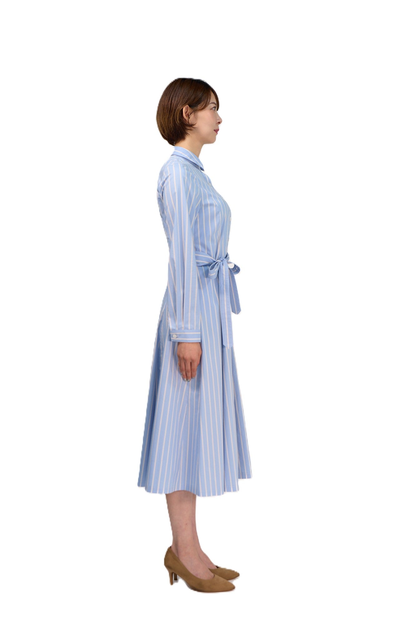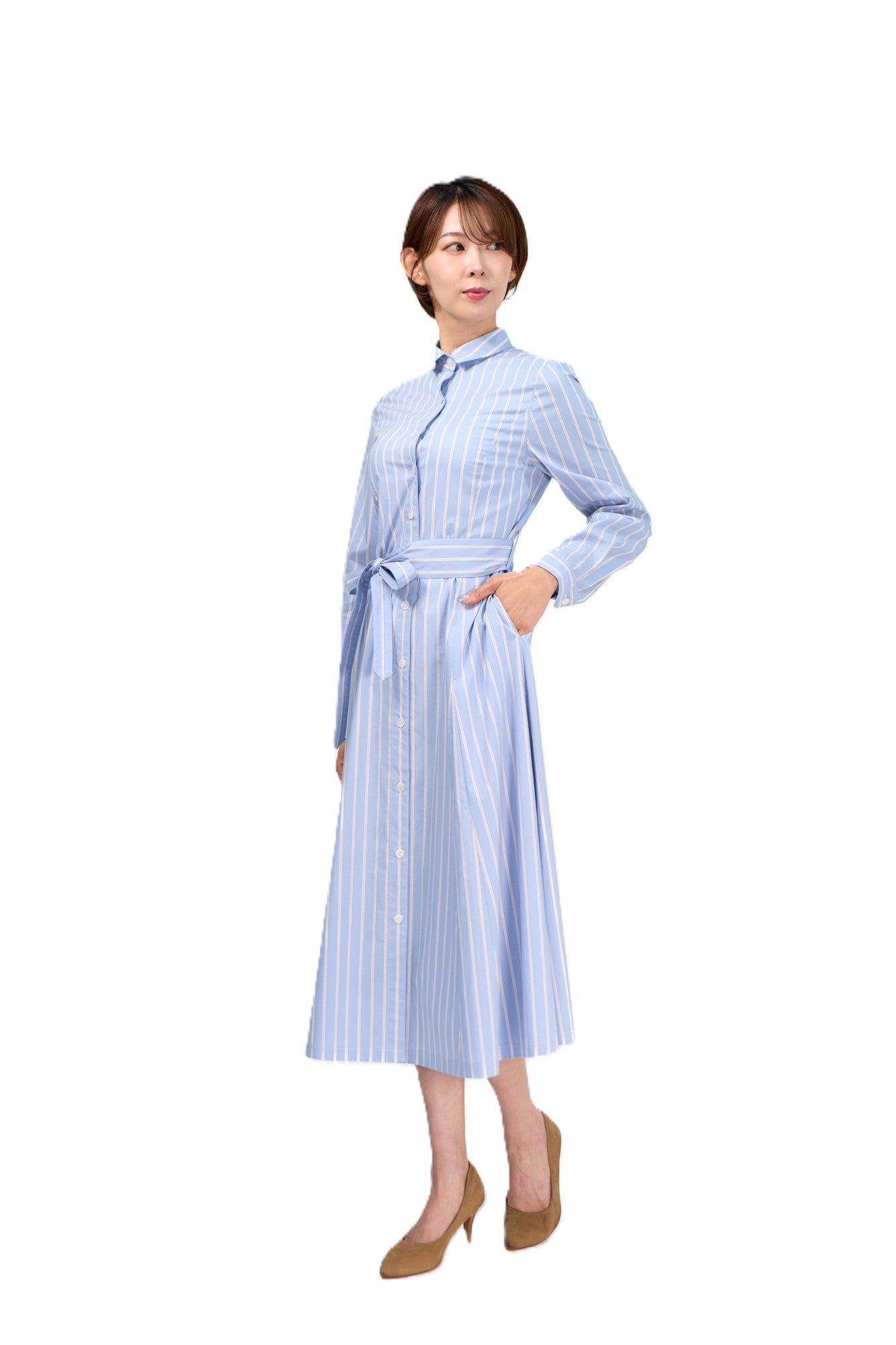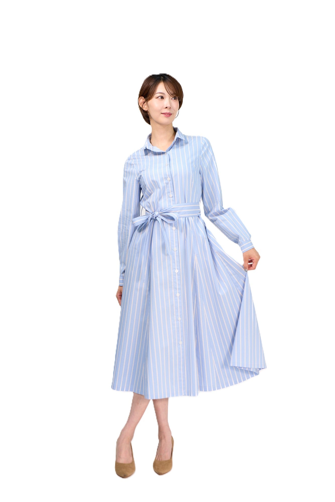 【イタリア製ストライプシャツ生地】太ベルト付き 長袖 フィット&フレアーワンピース