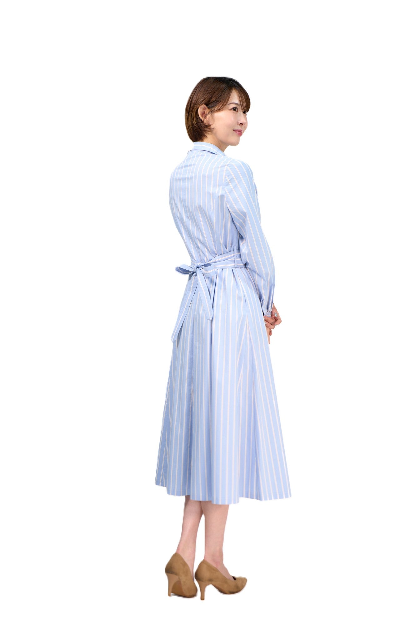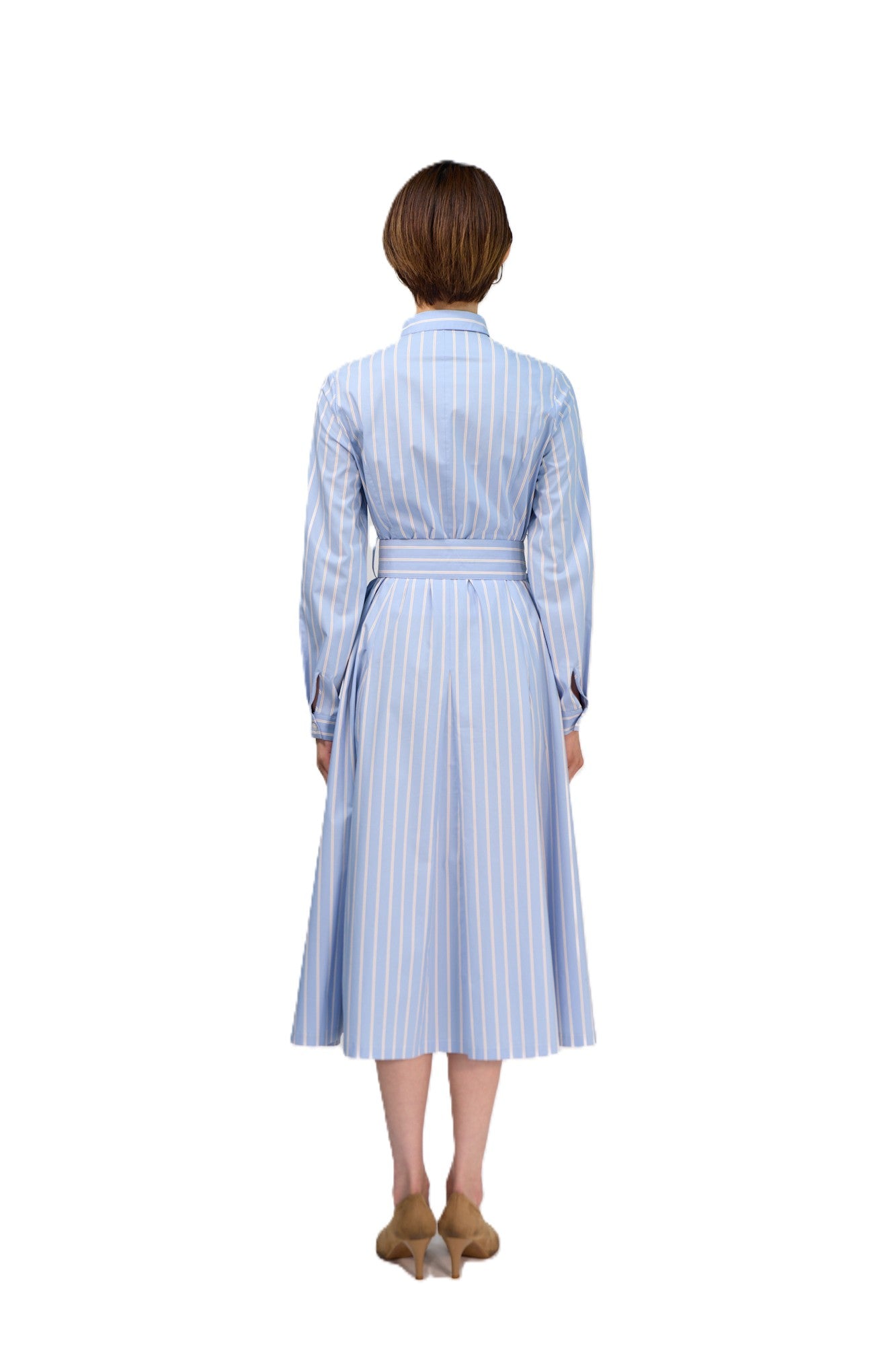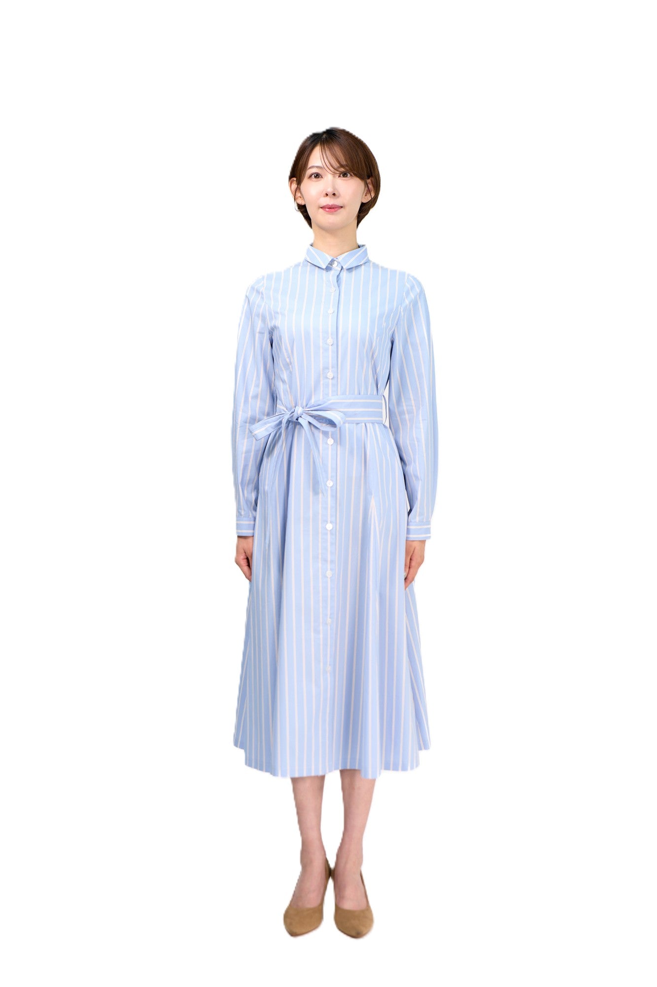 【イタリア製ストライプシャツ生地】太ベルト付き 長袖 フィット&フレアーワンピース